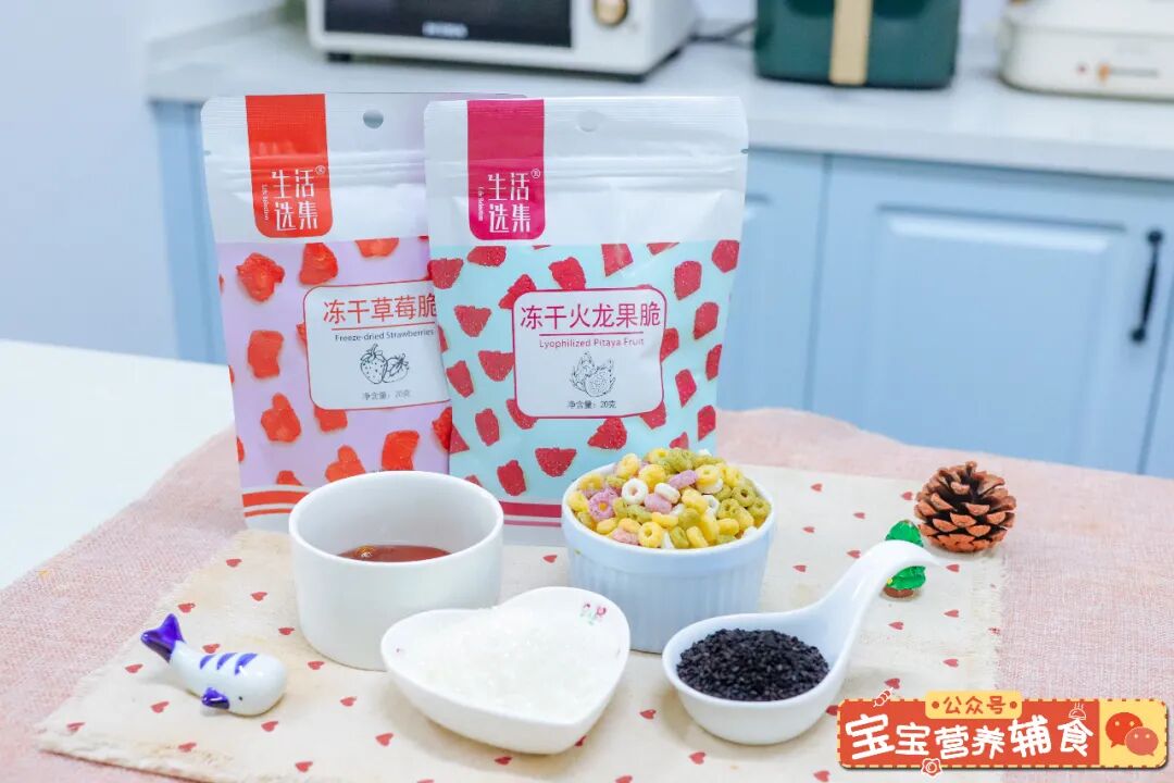 食材:谷物圈90克、白砂糖40克、麦芽糖15克、黑芝麻10克、冻干草莓1袋、冻干火龙果1袋.