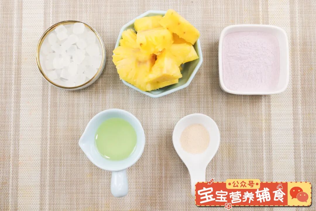食材:紫薯面粉100克、菠萝1000克、冰糖20克、玉米油20克、酵母1克
