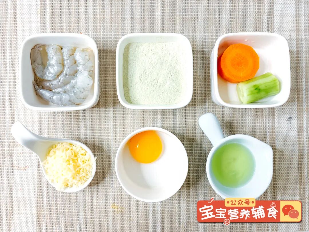 食材:菠菜面粉50克、虾4只、蛋黄12克、蛋清32克、奶酪20克、胡萝卜30克、黄瓜25克