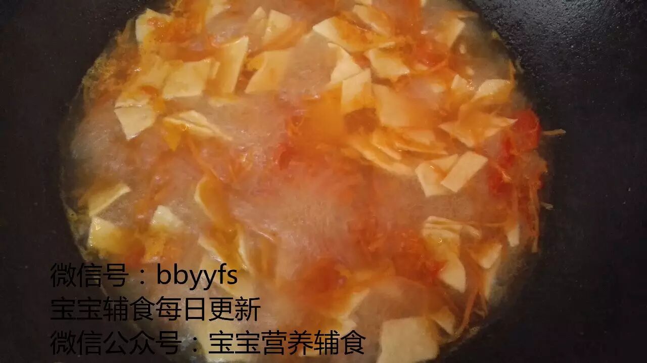 9.添水没过西红柿,烧开后下入胡萝卜丝和面片。