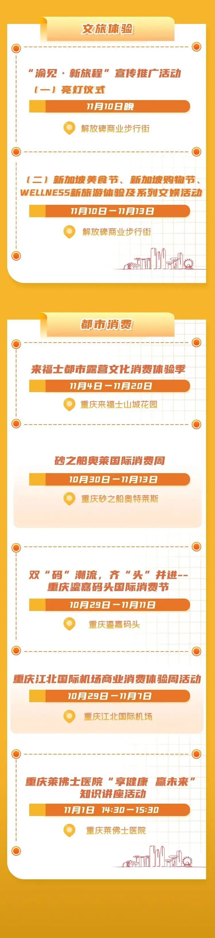 除了商务交流,体验周期间还有一系列亲民的体验活动。其中,“渝见·新旅程”主题宣传推广活动将于11月10日—13日在解放碑步行街举办,活动集美食、购物、品牌展示、灯光艺术、文艺表演、旅游推介等于一体,让市民足不出“渝”,也能沉浸在新加坡的风土民情中。