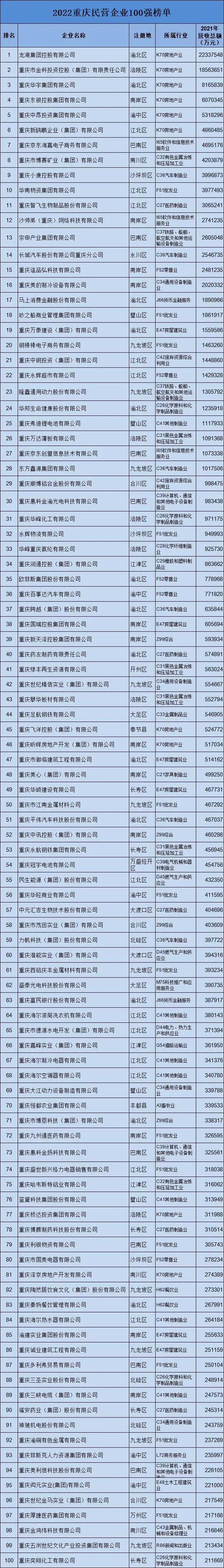 2022重庆民营企业100强榜单