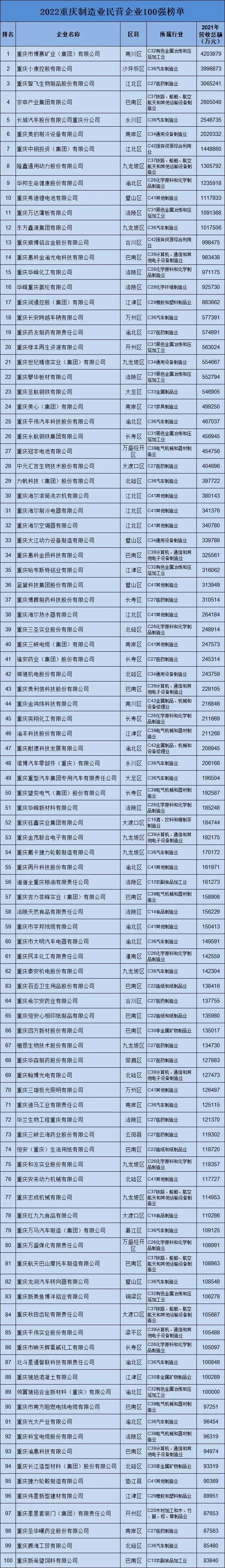 市工商联相关负责人表示,此次发布的重庆市民营企业100强,由区县工商联、商(协)会组织企业自愿在全国工商联民营企业上规模调研系统中申报,按营收总额排序而来。调研对象为注册在重庆辖区内的民营企业、非公有制经济成份控股的有限公司和股份有限公司,调研数据的时间范围是2021年1月1日至12月31日。