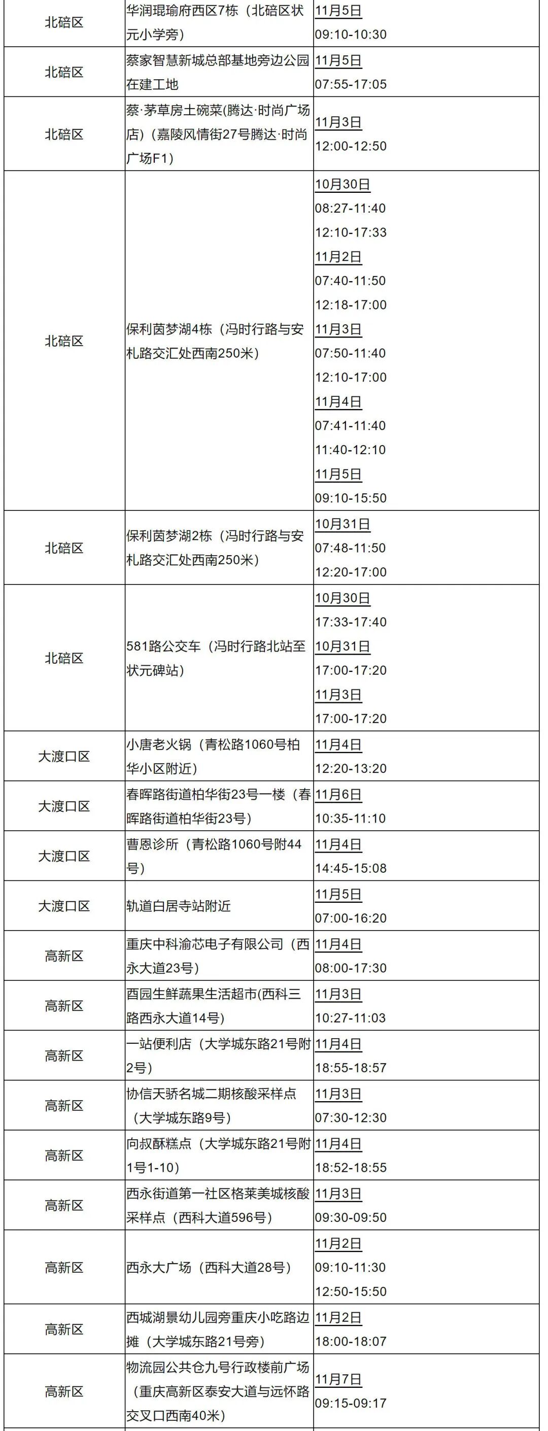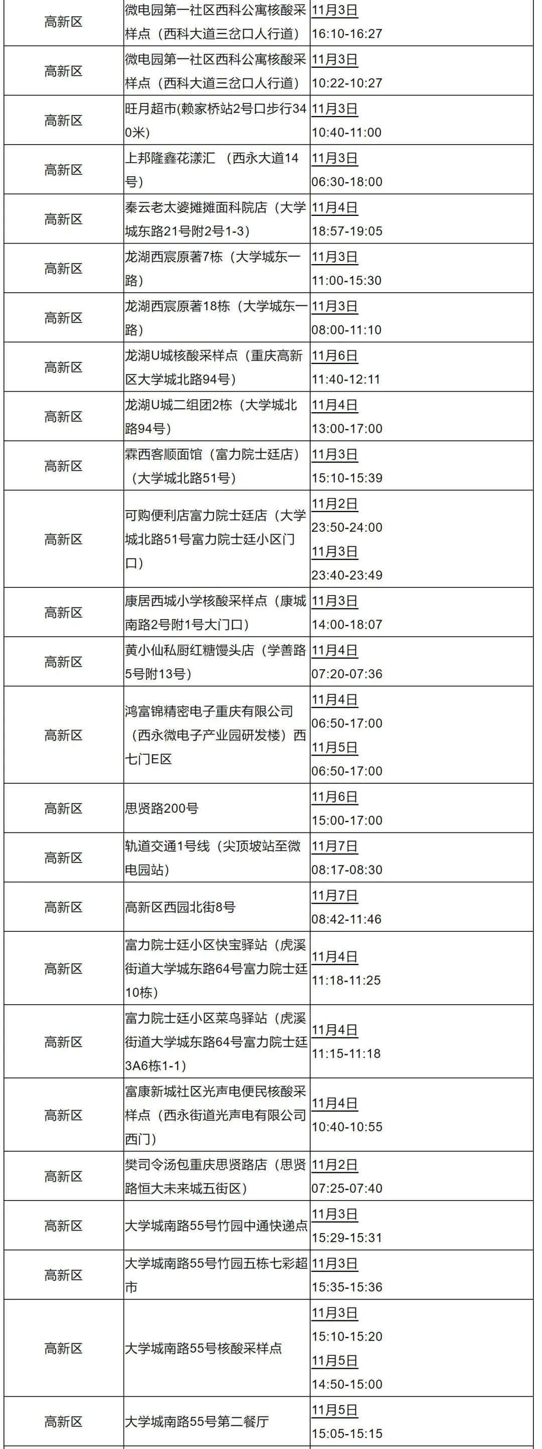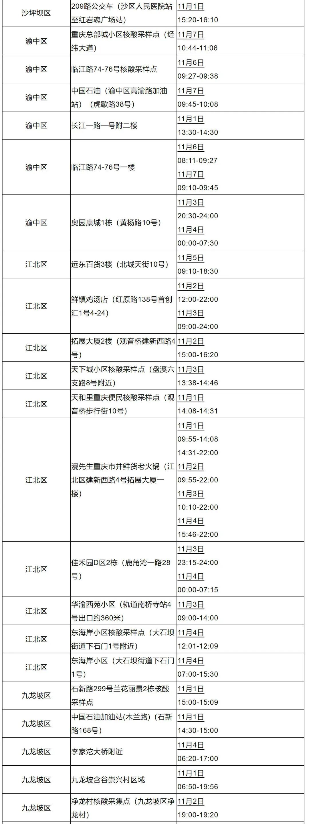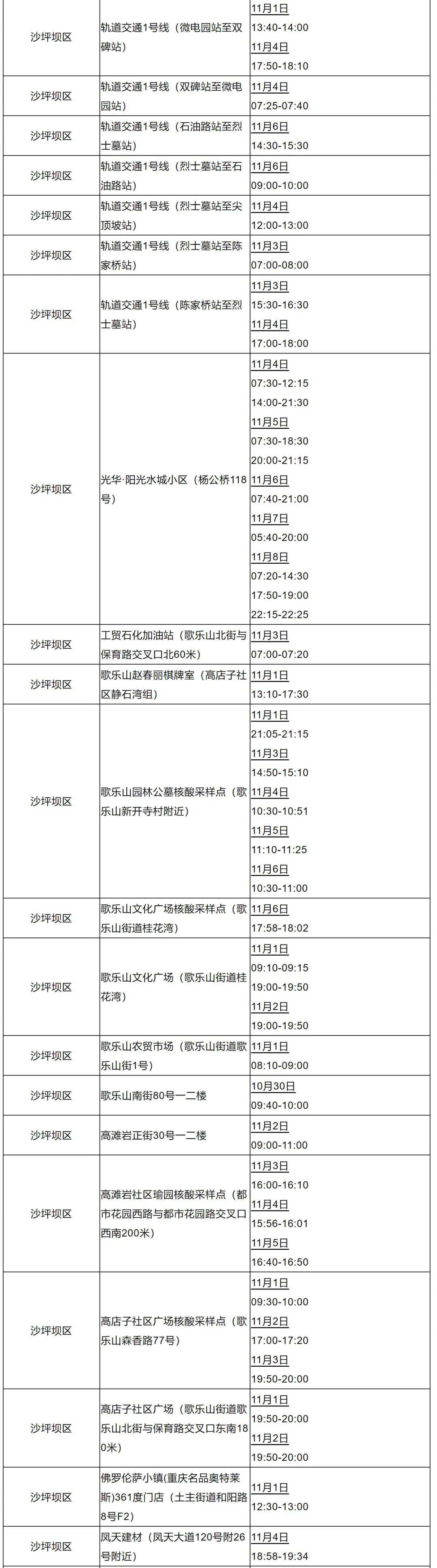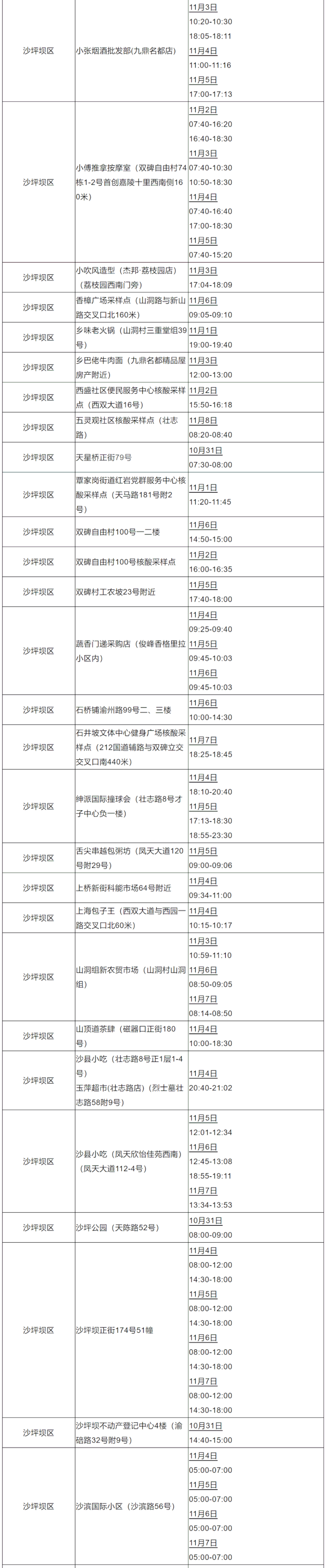 2022年11月9日,沙坪坝区新增报告20例确诊病例和123例无症状感染者。现将在渝主要活动轨迹的风险点位和时间通告如下: