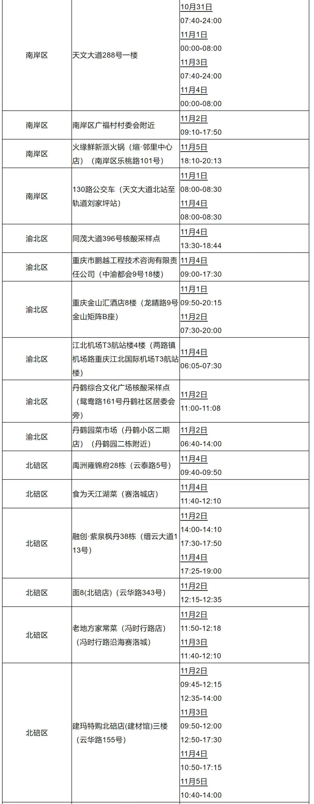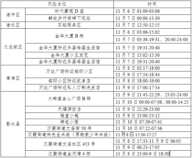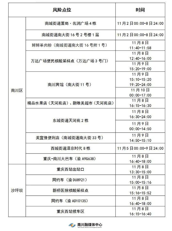 2022年11月10日,南川区新增报告1例确诊病例(轻型)和6例无症状感染者。6例在隔离管控人员中发现,1例在重点人员核酸检测中发现。现将在渝主要活动轨迹的风险点位和时间通告如下: