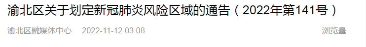按照国务院联防联控机制相关规定,经市疾控专家研判和区新型冠状病毒肺炎疫情防控工作指挥部研究决定,从2022年11月12日6时起,将渝北区部分区域划定为高风险区,现通告如下: