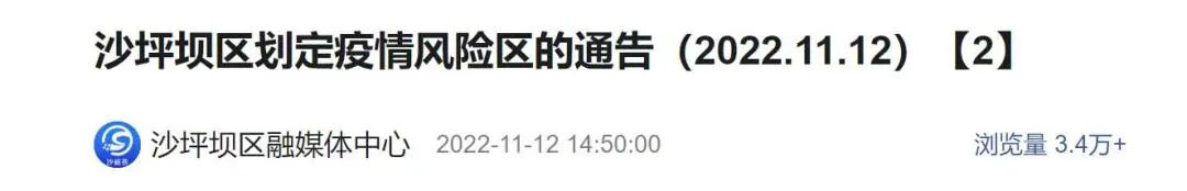 根据当前沙坪坝区疫情防控工作需要,按照《新型冠状病毒肺炎防控方案(第九版)》和国务院联防联控机制综合组《关于进一步优化新冠肺炎疫情防控措施科学精准做好防控工作的通知》相关规定,经市区疾控专家研判和区新冠肺炎疫情防控指挥部研究决定,自2022年11月12日15时起,将沙坪坝区部分区域划定为高低风险区,具体如下: