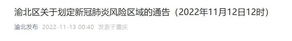 按照国务院联防联控机制相关规定,经市疾控专家研判和区新型冠状病毒肺炎疫情防控工作指挥部研究决定,从2022年11月12日12时起,将渝北区部分区域划定为高风险区,现通告如下: