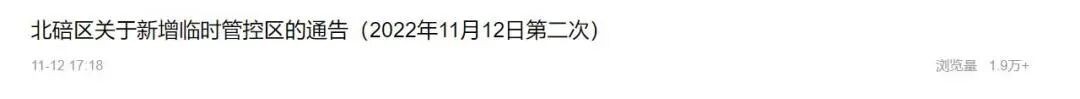 根据当前北碚区疫情防控工作需要,按照《新型冠状病毒肺炎防控方案(第九版)》相关规定,经北碚区新型冠状病毒肺炎疫情防控指挥部研究,决定自2022年11月12日14时起,对北碚区相关区域实行临时管控。现将有关事项通告如下: