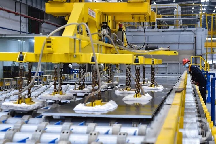 西南铝厚板生产线员工在装炉准备淬火。西南铝供图