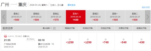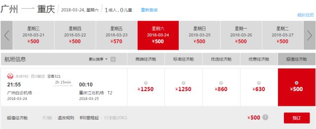 现在川航官网搜索3月24日前往重庆的航班价格为:500元