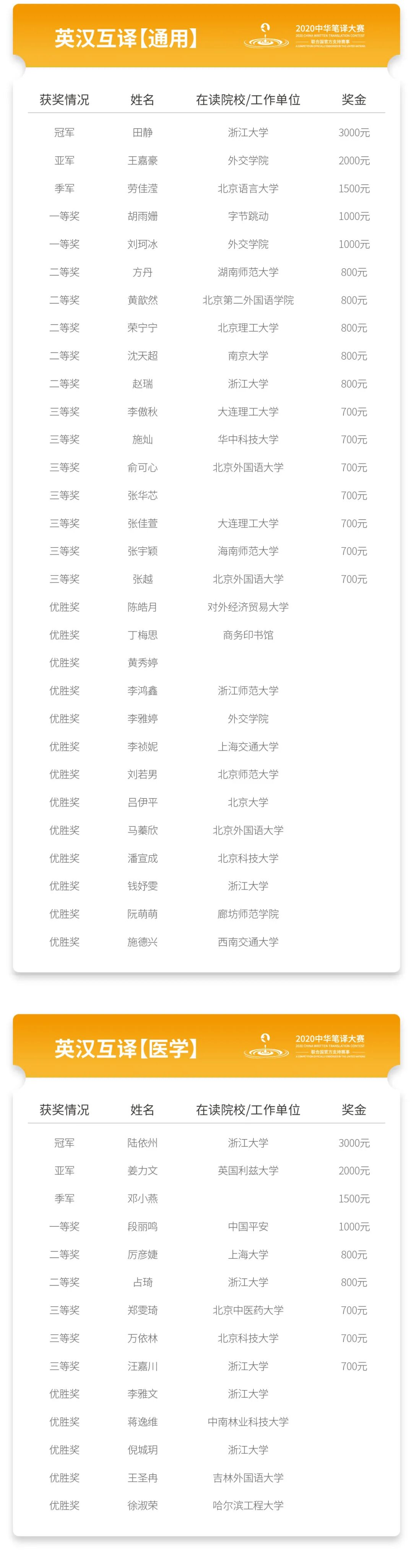 亚军 | ✓ 奖金2000元; ✓ 获奖证书; ✓ 可免费参加一门策马翻译(集团)培训中心的笔译类课程(价值5900元); ✓ 将由组委会推荐至策马 “国际组织翻译人才选调计划”; ✓ 大赛组委会将为其推荐国内行业机构实习机会、国家机关及企事业单位就业机会和赴海外进修或留学机会; ✓ 大赛组委会将提供承接国际组织文件翻译的工作机会。 |