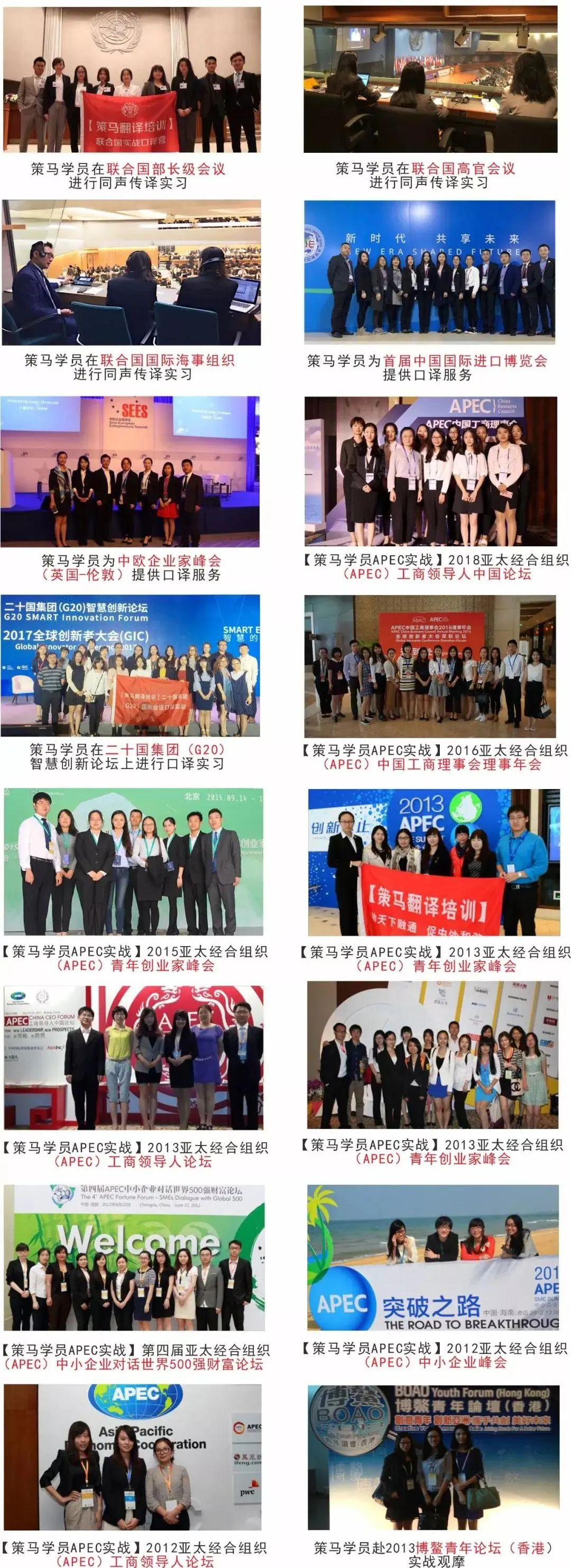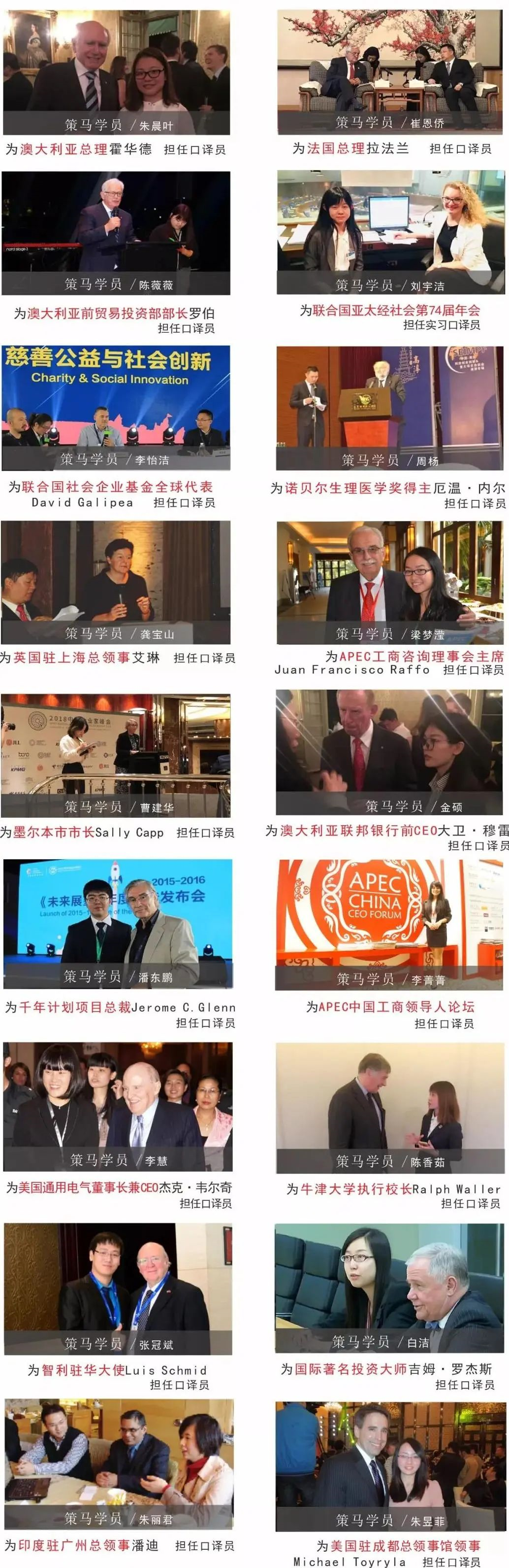 学员均可免费加入“策马译族精英俱乐部”,定期开展外交部翻译室高级翻译讲座、国际高端会议口译实战/观摩、参观访问、大使沙龙等精品活动。