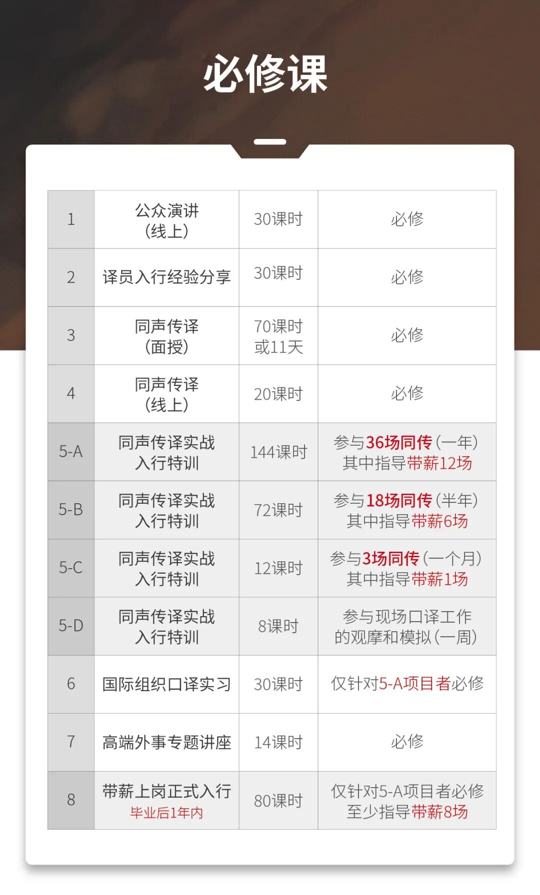 【必修课、选修课】均由拥有丰富国际会议口译实战和专业口译教学经验的联合国译员、欧盟译员、国际会议口译员协会(AIIC)会员、美国国务院译员、中国外交部翻译司前高级翻译、亚太经合组织(APEC)峰会译员执教。