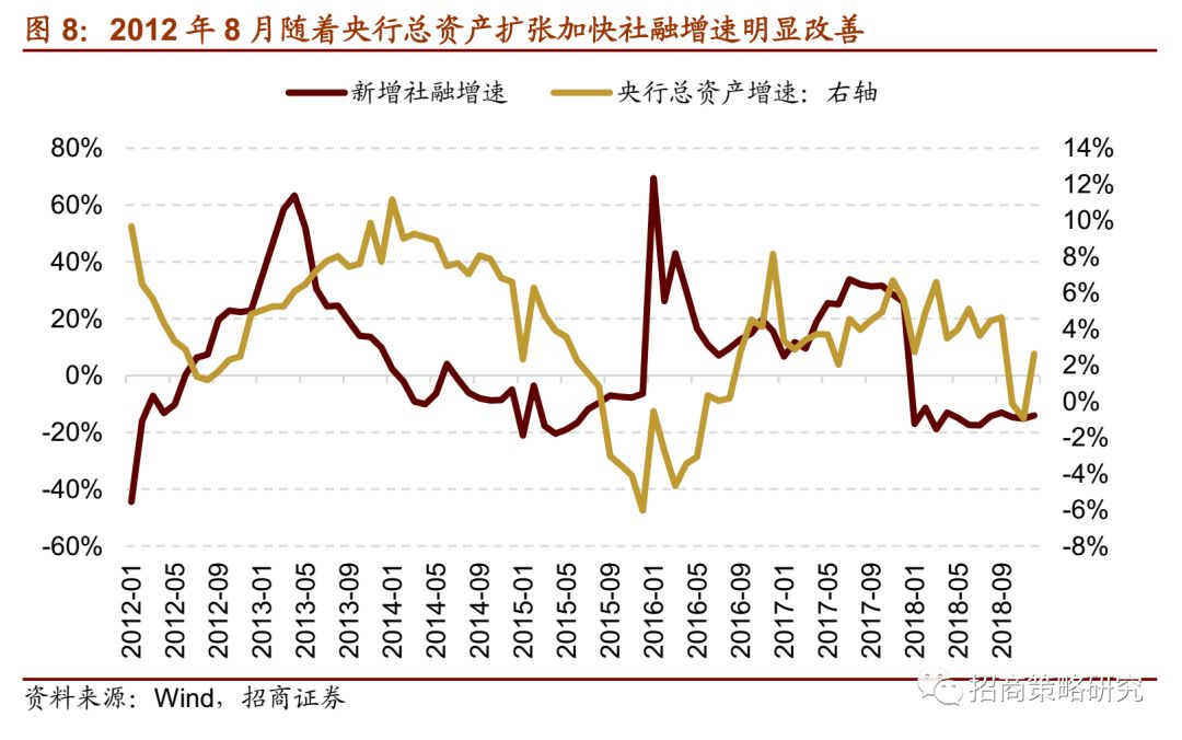 2012年8月,外汇储备出现了最后一轮明显增加,伴随着外汇储备增加,央行总资产增速明显提升,2012年8月开始社融增速明显改善。