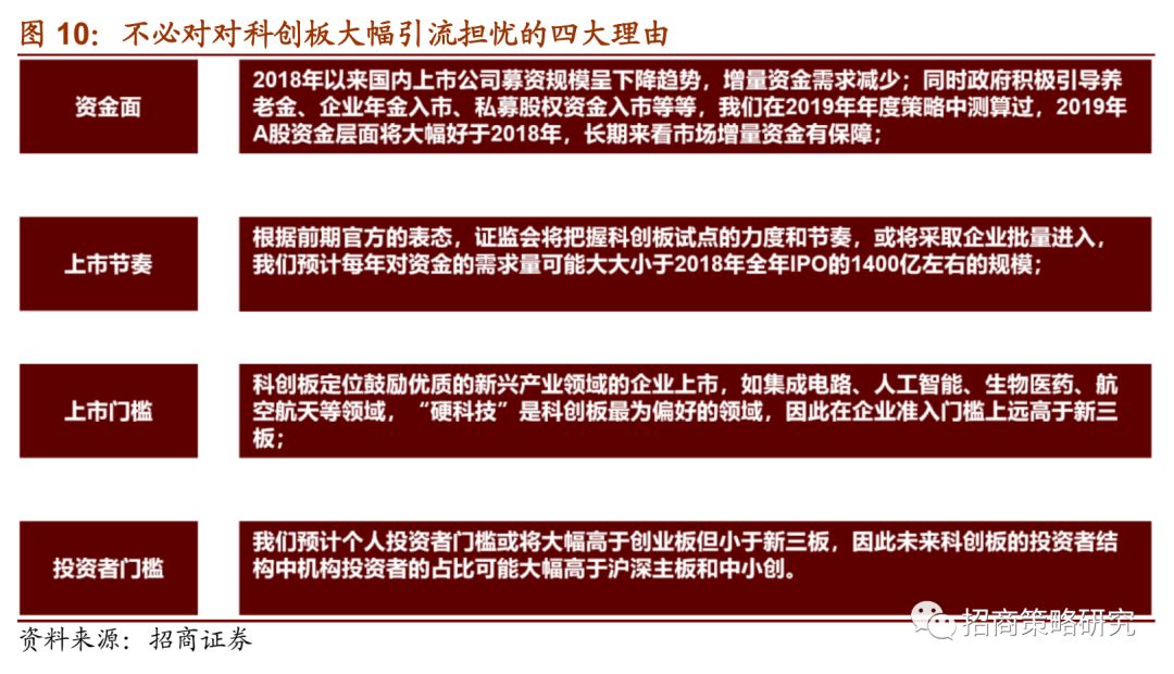 另一方面,从流动性角度看,许多投资者担忧由于科创板的设立,势必将造成市场的资金分流,或将影响市场流动性。我们认为,在可预见的时期和当前的政策预期下,基于对A股资金面、科创板上市节奏、科创板上市门槛、科创板投资者门槛四大方面考虑,这种担忧是不必要的。