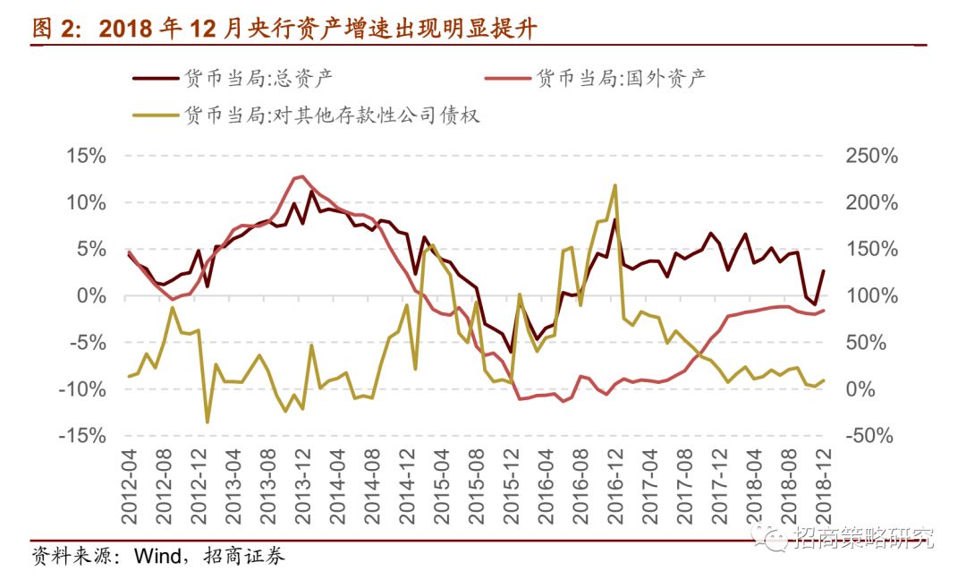 2018年12月,央行总资产规模出现非季节性扩张,主要来自“对其他存款性公司债权”和“其他资产”的扩张。若目前央行的扩表行为持续下去,可能造成某一类金融资产价格的明显回暖。近期定向可转债落地以及科创板的快速推进都表明政府积极引导流动性投向股权类资产,央行扩表行为可能带来股权资产升值。