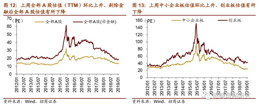 估值方面,全部A股估值(TTM)略微上升,从13.71升至13.75,但剔除金融后全部A股估值有所下降,从18.75降至18.71。中小板估值从24.27升至24.31,创业板估值继续下降,从42.57降至42.42。中小板指估值从19.83升至19.85,创业板指估值从28.82降至28.65。沪深300成份股估值从10.66升至10.74,中证500成份股估值从16.90降至16.84。