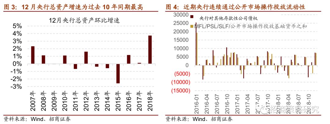 今年12月央行总资产增速为过去10年同期最高。按照资产类别拆分,12月央行通过MFL、PSL、公开市场操作,投放了7400亿流动性,因此央行对其他存款性公司债权现增加7400亿。1月至今央行继续通过公开市场操作投放流动性,截止1月25日,1月公开市场操作提供5300亿流动性。同时,央行开始首次TMLF操作,投放2575亿流动性。考虑到1月两次降准实施,继12月大幅投放流动性后,2019年1月继续大幅投放流动性。