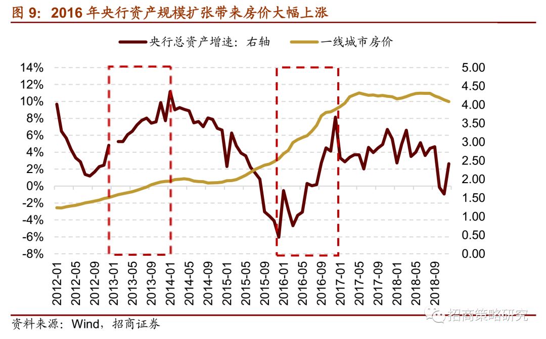 2012年下半年至2013年经济出现了一轮小幅的反弹,股票市场在2012年12月-2013年2月有一波明显的反弹,而本轮央行的扩表,更多体现在地产价格上,一线城市地产价格快速上行一波。
