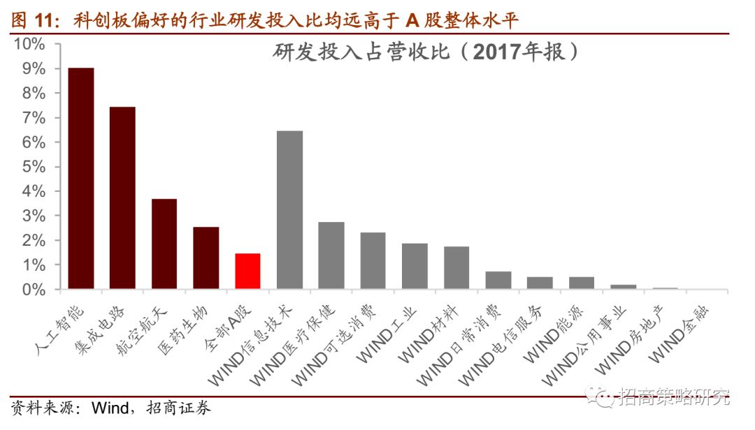而科创板偏好的人工智能、集成电路、航空航天、生物医药等都属于高研发投入比的领域,根据2017年年报数据,上述四个领域的研发投入占营收比分别为9.01%、7.44%、3.69%、2.55%,远高于全部A股的1.44%。由于科创板偏好的行业研发投入比均较高,科创板开通后估值体系将发生变革,研发投入将纳入估值体系,因此科创板整体板块以及公司的估值方法将跟传统估值法有所差异,这将产生两大影响: