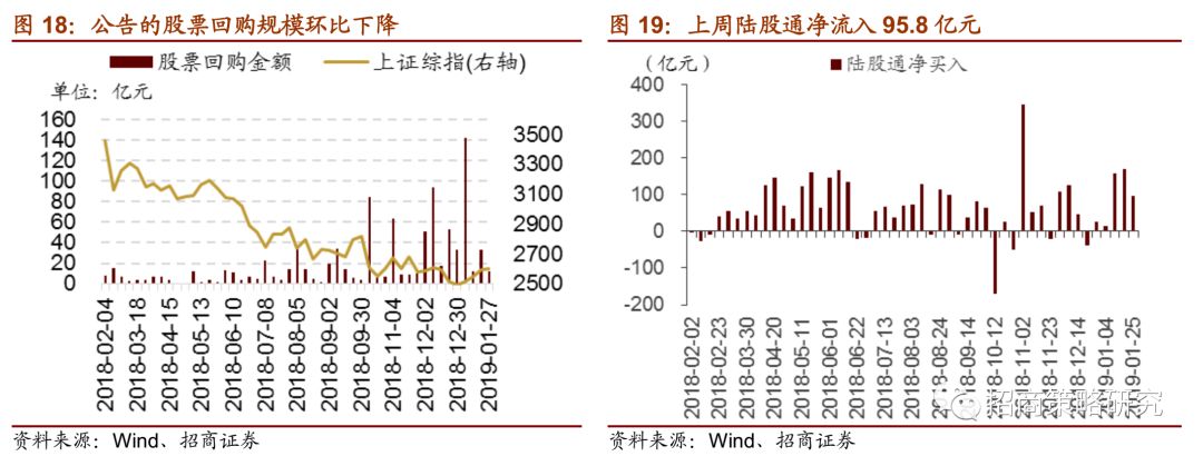 分项资金面方面,下周限售股解禁规模下降,首发解禁规模为142亿元,定增解禁规模为177亿元;上周全周重要股东二级市场减持16.92亿元,增持17.91亿元,净增持0.98亿元;上市公司回购规模环比下降,上周公布的已回购金额为12.06亿元。陆股通资金全周净流入95.8亿元,比上周减少74.5亿元;两融余额有所下降,为7473.62亿元,较前一周减少33.63亿元;上周截止至2019.1.24日,新成立偏股型基金28.63亿份,规模较上周减少3.38亿元。