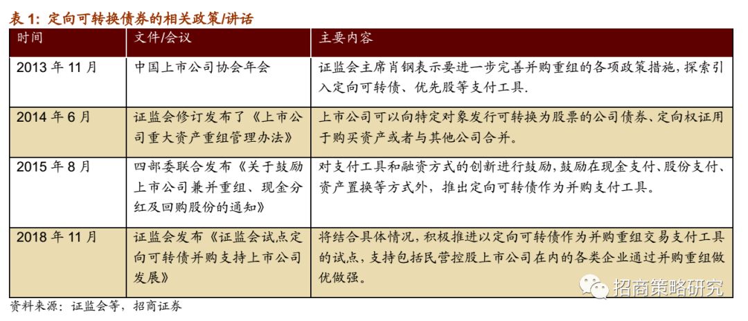 2018年11月1日,证监会发布《证监会试点定向可转债并购支持上市公司发展》,表示其将结合具体情况,积极推进以定向可转债作为并购重组交易支付工具的试点,支持包括民营控股上市公司在内的各类企业通过并购重组做优做强。