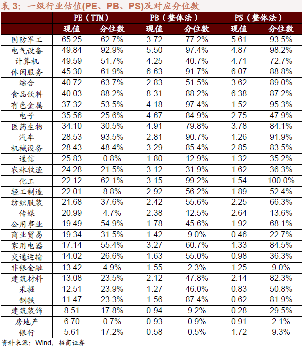 在行业估值方面,本周板块估值涨少跌多,其中,医药生物板块估值上涨较多,涨幅为0.9X,国防军工、有色金属板块下跌较明显,跌幅超过2.0X。其中,医药生物板块上涨0.9X至34.1X,处于30.5%历史分位;国防军工板块估值下跌3.5X至65.2X,处于62.7%历史分位;有色金属板块估值下跌2.7X至37.3X,处于53.5%历史分位。截至9月17日收盘,一级行业估值排名前五的行业分别是国防军工、电气设备、计算机、休闲服务、综合。