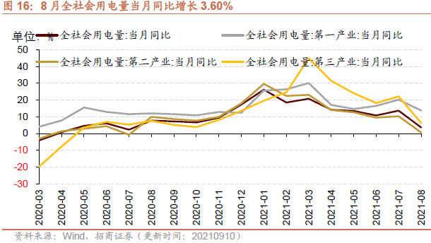 8月份全社会用电量同比增速放缓。8月份全社会用电量当月值7607.0亿千瓦时,当月同比增长3.6%,增速较上个月降低10.08个百分点。细分产业来看,第一产业当月用电量107.0亿千瓦时,同比增长13.7%;第二产业当月用电量4851.0亿千瓦时,同比增长0.6%;第三产业当月用电量1400.0亿千瓦时,同比增长6.2%,增速较上个月降低15.93个百分点。