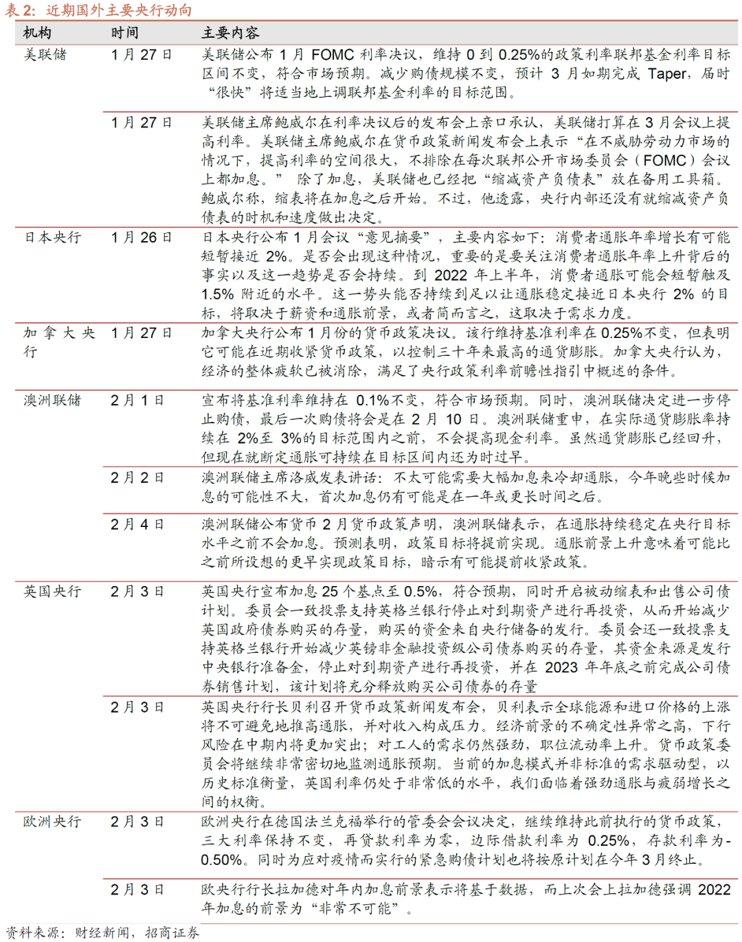 英国继续加息并开启缩表。2月3日英国央行宣布加息25bp至0.5%,这是英国央行继去年12月后的第二次加息。委员会一致同意停止对到期资产进行再投资,以减少对英国政府债券的持有量,并且也将减少对企业债券的持有量,停止对企业债券到期资产再投资并实施不早于2023年底完成的企业债券销售计划。英国央行预计,英国消费者价格指数(CPI)今后几个月内将继续上涨,并在4月份达到7.25%的峰值。并且英国央行表示,如果经济发展实际情况符合预期,今后几个月内将会进一步适度收紧货币政策。