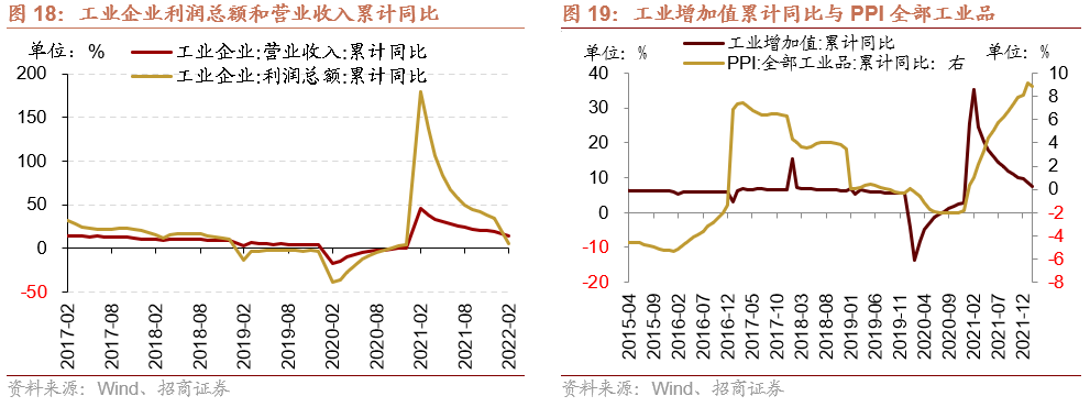 进一步利润结构拆分,成本上升,费用下降,利润率略有降低。由于原材料价格维持高位,企业成本继续上行,工业企业每百元营业收入中的成本由前值的83.74提升至83.91;发生营业成本合计16.28万亿元,增长15.0%;但另一方面,企业费用持续压降,2月份工业企业每百元营业收入中费用由12月份的8.59降低至8.27。由于原材料价格上行带来成本上行较大,工业企业营业收入利润率同比增长5.97%,相比前值6.81%有进一步的收窄。