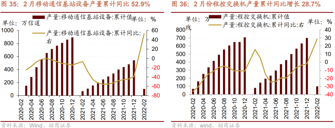 2月份移动通信基站产量累计同比转正。2022年1-2月,我国移动通信基站产量为102.3万信道,累计同比上升52.90%,较2021年12月累计同比扩大92.30个百分点。