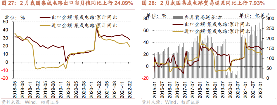 2月集成电路进出口金额同比增幅有所收窄,贸易逆差同比增幅收窄。2月份集成电路出口金额当月值为110.05亿美元,当月同比上行24.09%,涨幅较上月收窄5.84个百分点,当月值较2020年同期增长47.52%;1-2月份集成电路出口金额累计同比上行27.70%。