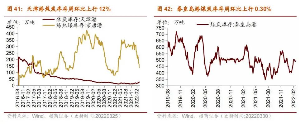 库存方面,本周京唐港炼焦煤库存下行,秦皇岛港、天津港焦炭库存上行。截至 3 月 30日,秦皇岛港煤炭库存报506.00 万吨,周环比上行 0.30%;截至 3 月 25 日,京唐港焦煤库存报 137.00 万吨,周环比下行 14.38%;天津港焦炭库存报 28.00 万吨,周环比上行 12%。