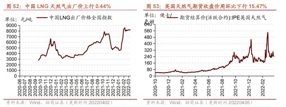 我国天然气出厂价下行,英国天然气期货结算价上行。截至4月2日,我国天然气出厂价报8213.0元/吨,较上周上行0.44%;截止4月5日,英国天然气期货结算价收于242..24便士/色姆,较上周下行15.47%。