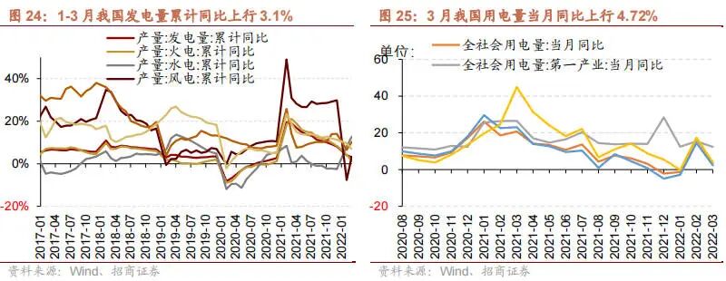 3 月我国用电量累计同比增幅收窄 ,其中第一、第二、第三产业用电量增幅均收窄。3 月份,我国全社会用电量6944.0 亿千瓦时,当月同比上行 4.72%,增幅较前值收窄 13.73 个百分点;其中第一产业当月用电量 78.0 亿千瓦时,同比上行 14.9%;第二产业当月用电量 4790.0 亿千瓦时,累计同比上行 3.79%;第三产业当月用电量 1063.0亿千瓦时,累计同比上行 4.46%。