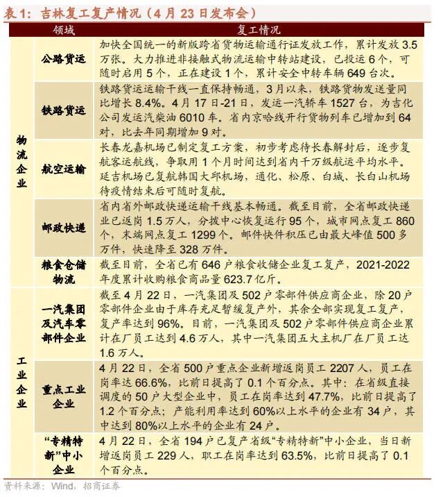 从影响最大的两个区域吉林和上海的情况来看,根据吉林省统筹疫情防控和经济社会发展专题新闻发布会上发布的数据,截至 4 月 22 日,剔除季节性停产、受资金市场等因素影响停产的企业外,全省规模以上工业企业复工率达96.3%。除长春市外,其他市州复工率全部达到 98%以上。