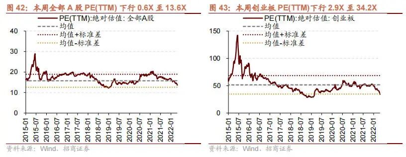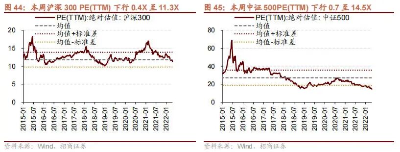 本周全部 A 股估值水平下行。截至 4 月 22 日收盘,全部 A 股 PE(TTM)下行 0.6X 至 13.6X,处于历史估值水平的29.5%分位数。创业板本周下行,PE(TTM)下行 2.9X 至 34.2X,处于历史估值水平的 11.9%分位数。代表大盘股的沪深 300 指数 PE(TTM)本周下行 0.4X 至 11.3X,处于历史估值水平的 34.4%分位数。代表中小盘股的中证 500指数 PE(TTM)本周下行 0.7 至 14.5X,处于历史估值水平的 0.0%分位数。