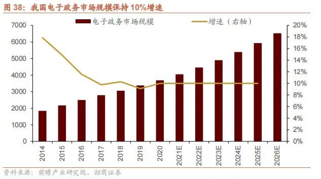 根据前瞻产业研究院的统计,目前我国电子政务市场规模为 4000-4500 亿元左右,大概每年以 10%的增速增长。未来,随着云计算、大数据、人工智能、物联网等新兴技术在政府领域的广泛应用,基础信息资源库、电子政务信息系统等多个重大工程项目建设的不断深入,我国数字政府市场将保持高速发展状态。