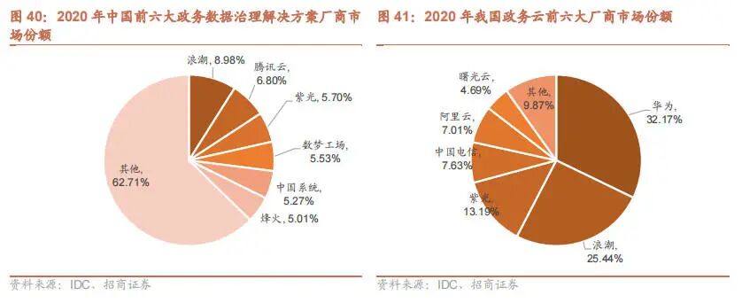 目前数字政府市场竞争格局较为分散,政务云市场竞争格局相对集中。根据 IDC 的报告,2020 年中国前六大政务数据治理解决方案厂商分别是浪潮、腾讯云、紫光、数梦工场、中国系统和烽火,但是他们的市场份额均不超过 10%。从政务云这一细分市场来看,市场格局较为清晰,主要的公司是华为、浪潮、紫光、中国电信、阿里云、曙光云。