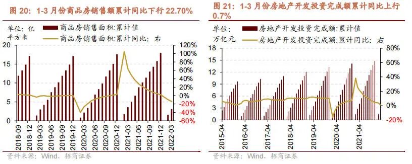 1-3 月份商品房销售额累计值为 2.97 万亿元,累计同比下行 22.70%,降幅扩大 3.4 个百分点;1-3 月份商品房销售面积累计值为 3.10 亿平方米,累计同比下行 13.80%,降幅扩大 4.2 个百分点;1-3 月份房地产开发投资完成额累计值为 2.78 万亿元,累计同比增长 0.7%,增幅较前值收窄 3.0 个百分点。