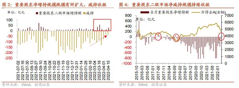 3 月以来,随着市场调整,重要股东二级市场减持动力明显下降,且部分公司股东积极增持,整体增持规模有所扩大,彰显出上市公司股东对公司的信心,减轻股票的流动性压力。目前来看,净减持规模持续收敛,4 月截止目前累计净减持规模仅 75 亿元,逐渐趋近转正的状态,此前重要股东单月净增持出现在 2017 年 5 月、2018 年 10 月。