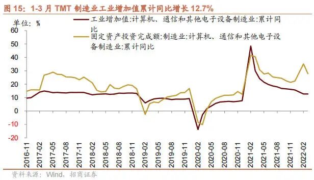 1-3 月 TMT 制造业固定资产投资增速收窄。1-3 月份计算机、通信和其他电子设备制造业固定资产投资完成额累计同比为 27.8%,相比 1-2 月份增幅缩窄 7.3 个百分点;计算机、通信和其他电子设备制造业工业增加值累计同比增长12.7%,与 1-2 月份同比持平。