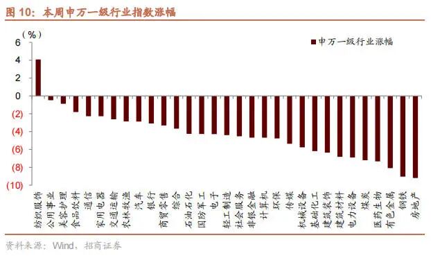 从行业上来看,本周申万一级行业多数下跌,仅 1 个一级行业上涨,纺织服装板块上涨 4.09%,房地产、钢铁、有色金属板块跌幅较大,均超过 8%。从涨跌原因来看,本周上涨的行业原因主要为,纺织服装板块主要受益于本周汇率的大幅贬值,由于汇率贬值带来的出口优势的增加。房地产、钢铁、有色一方面由于前期市场交易稳增长,但由于新开工等尚未大幅好转,叠加对疫情影响开工的担忧,造成短期博弈预期的交易型资金流出,此外,本周发改委继续强调压减粗钢产量,而海外加息主要为了抑制通胀,因此对部分大宗商品的情绪短期带来影响。