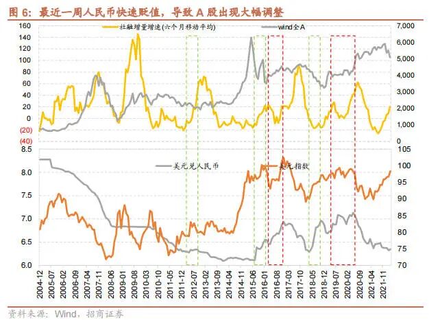 人民币汇率与 A 股的关系是什么,人民币汇率贬值是否一定会导致 A 股持续下跌?历史上来看,人民币出现趋势性贬值就发生过两轮,第一轮是 811 汇改开始,到 2016 年底,人民币汇率从 6.1 贬至 7,第二轮是从 2018 年 4 月贬至 2020 年 5 月,从 6.2 左右贬至 7.1。这两次贬值的背景都比较相似——中国由于经济下行,开启宽松政策;而美国尚在货币政策紧缩预期或者加息周期期间,我们在今年 1 月 23 日深度报告《中美货币政策背离后 A 股怎么走?见底信号是什么?》描述了这个原理,同时也提出了,今年上半年中国走向宽松,美国走向紧缩,人民币可能会有贬值压力,引发资金外流,导致市场承压。