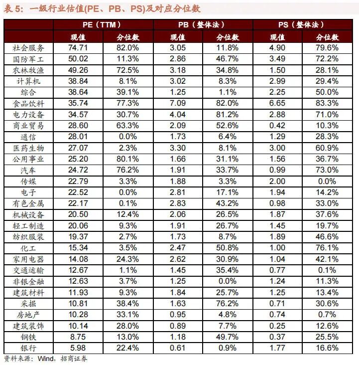 在行业估值方面,本周板块估值涨跌分化,其中,服装纺织板块估值上涨较多,涨幅超过 0.5X,综合板块下跌较明显,跌幅超过 10.5X。其中,服装纺织板块上涨 0.9X 至 19.4X,处于 2.7%历史分位;综合板块估值下跌 10.7X 至38.6X,处于 39.1%历史分位。截至 4 月 22 日收盘,一级行业估值排名前五的行业分别是社会服务、国防军工、农林牧渔、美容护理、计算机。
