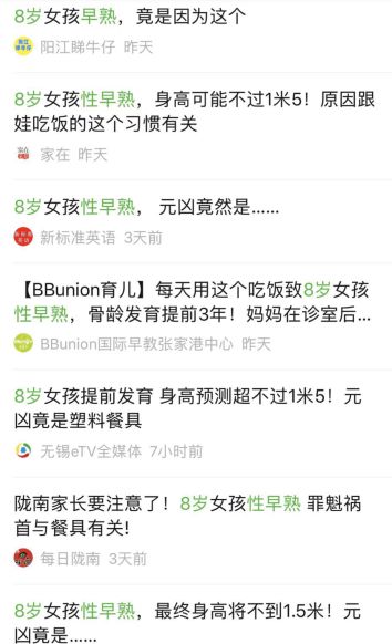 似乎每次假期前后,总会有一些奇怪的传闻出没。这次五一假期也看到不少,比如昨天提到的手足口(点击阅读:《手足口用玉屏风+利巴韦林预防治疗?这害人方式哪里来的?》)。另外一个也是最近这几天开始流行的消息“塑料饭盒导致性早熟”。