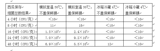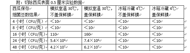 今年夏天宁波晚报报道了宁波象山食品检验检测中心的相关实验:实验人员模拟了家庭日常切瓜冷藏的步骤,然后分成四组:室温不盖保鲜膜、室温盖保鲜膜、冷藏不盖保鲜膜、冷藏盖保鲜膜。分别测试4、8、16、24和48小时之后的细菌情况。