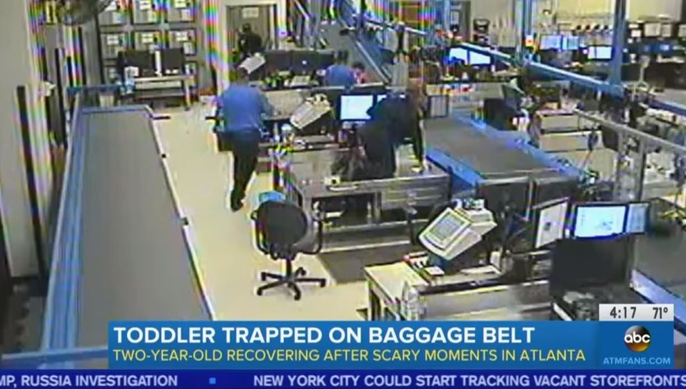 上周一(7月22日)下午,在亚特兰大机场的起飞值机大厅里,一个两岁的小朋友在母亲打印登机牌的时候,自己爬到了一个无人值守的行李传送带上,当妈妈发现之后追过去已经来不及拉他下来,于是这位小朋友就和行李一起踏上了此次奇妙的征途。