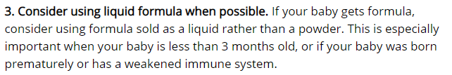 最后补充一个情况,WHO和CDC对于前面提到的高风险婴儿还给出了另外一个优先建议:在条件允许的时候,两家都建议有这些情况的家长优先使用经消毒的液体婴儿配方奶产品,来避免可能存在的感染风险。